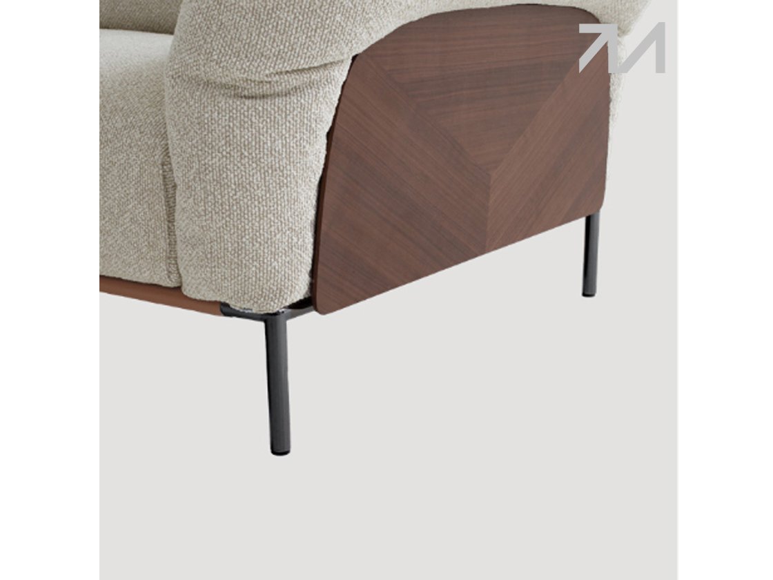 Este sofá lo tiene todo: formas generosas y acogedoras para un descanso absoluto, y un design que aporta carácter al ambiente. Su estructura combina un tapizado suave con detalles en chapa de nogal en los laterales, que enmarcan la pieza con un acabado cálido y sofisticado.